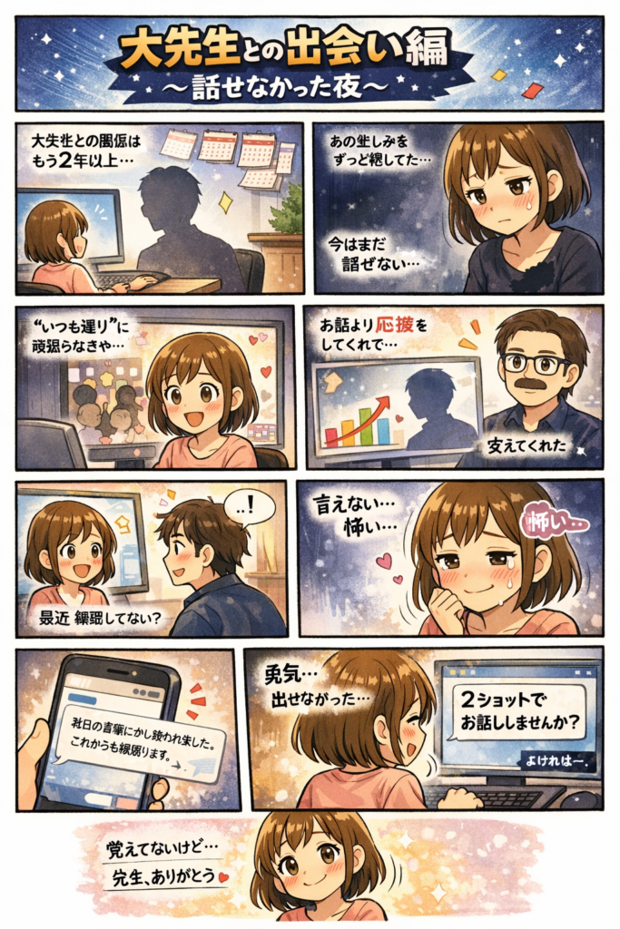 前のように、たくさんのことを話してくれて その中の大先生が言ってくれた言葉が胸に届いて、泣きそうになった。 でも、その時点では気持ちを伝える勇気がなかった。いや、自分の弱さを見せるのがどうしても怖かったからだ。